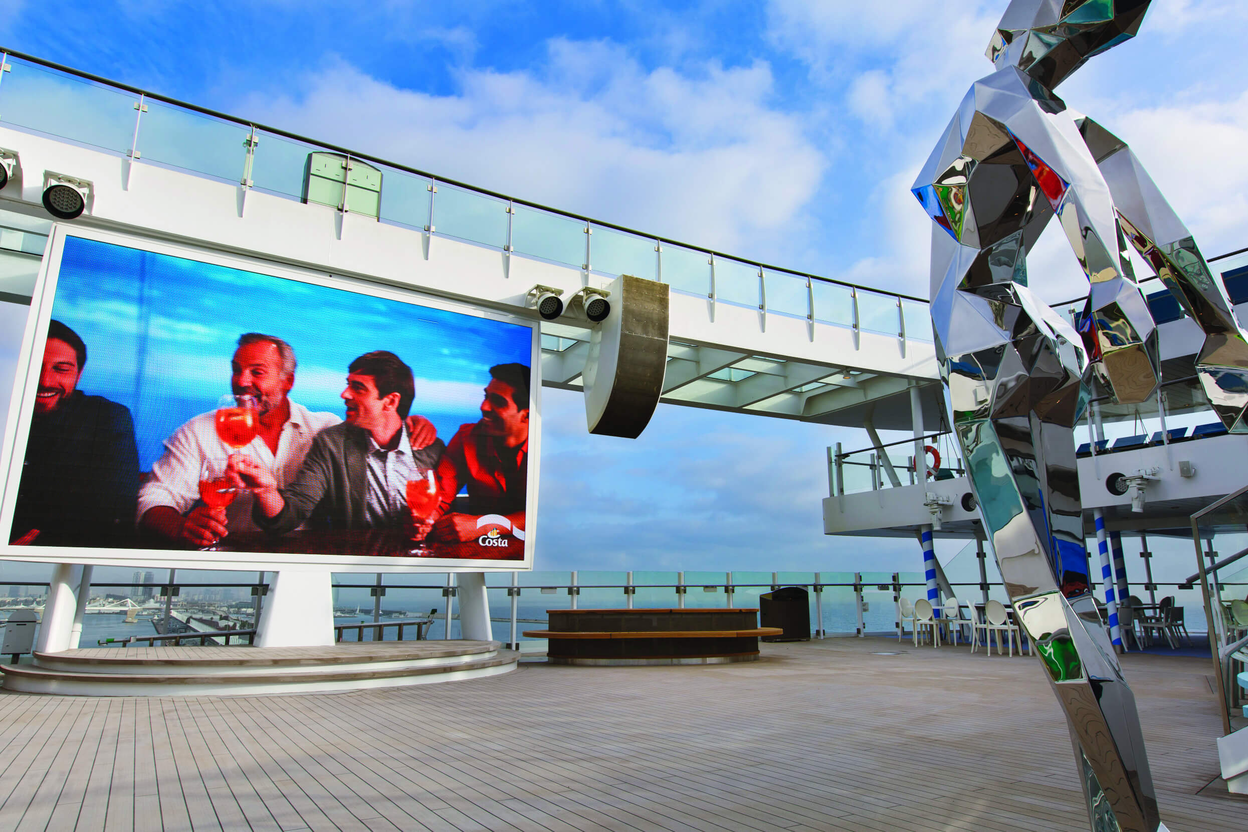 Ein moderner Außenbereich mit großem Bildschirm und einer kunstvollen Skulptur auf einem Schiff bei klarem Himmel.